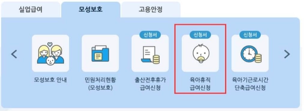 사이트에 들어가서 아래 메뉴 중 모성 - 육아휴직급여 신청 메뉴에서 신청하실 수 있어요.